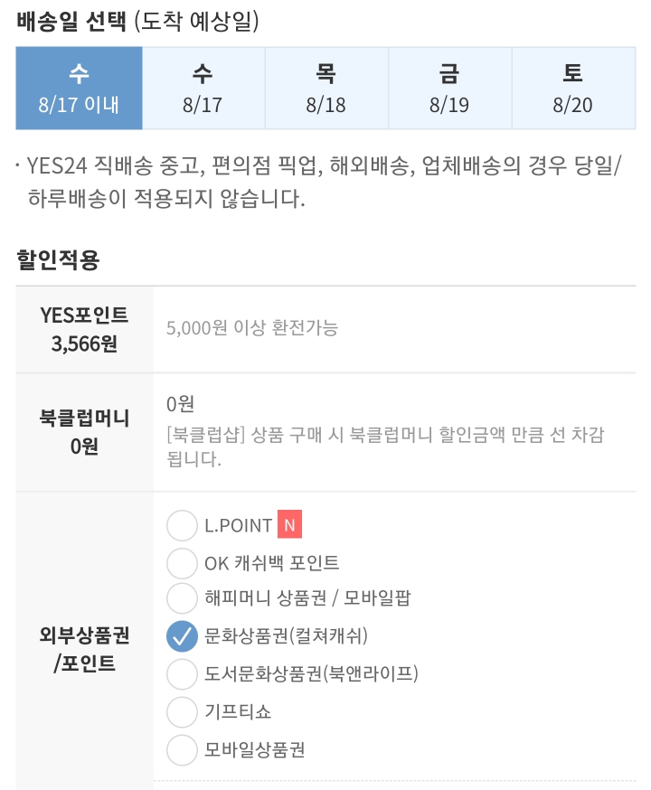 3. yes24에 결제 화면에 보면 컬쳐랜드로 결제하는것을 체크한뒤