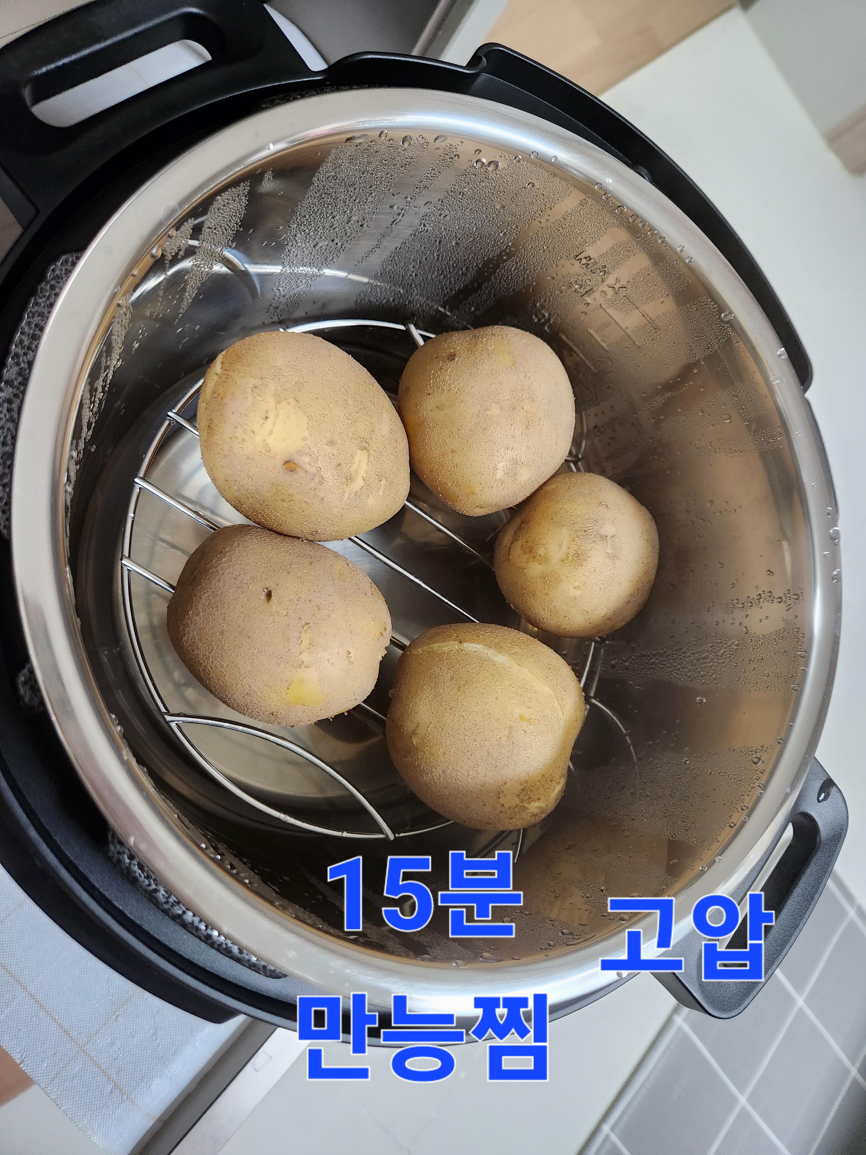 감자찔때는 씻은 감자를 제품에 함께 들어있던 채반에 올려서 만능찜에서 고압으로 15분 사용하니까 딱 ! 좋게 쪄졌습니다.