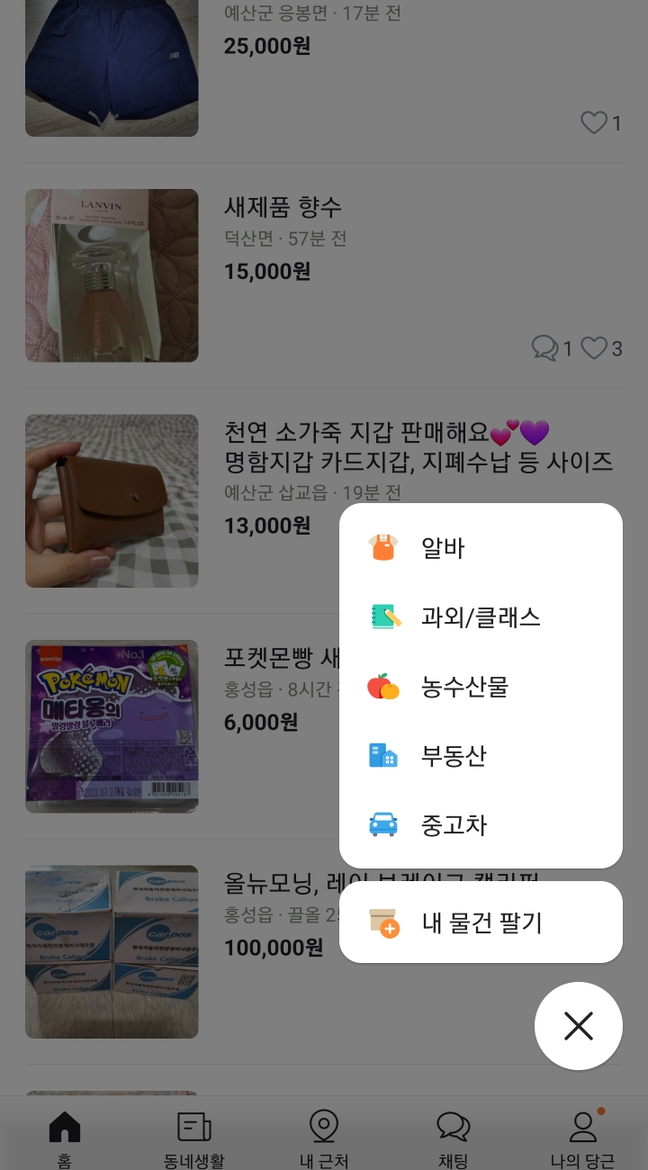 당근마켓 홈 화면에서 오른쪽 아래에 + 버튼을 누르면 이렇게 맨밑에 내물건팔기라는 버튼이 나와요.